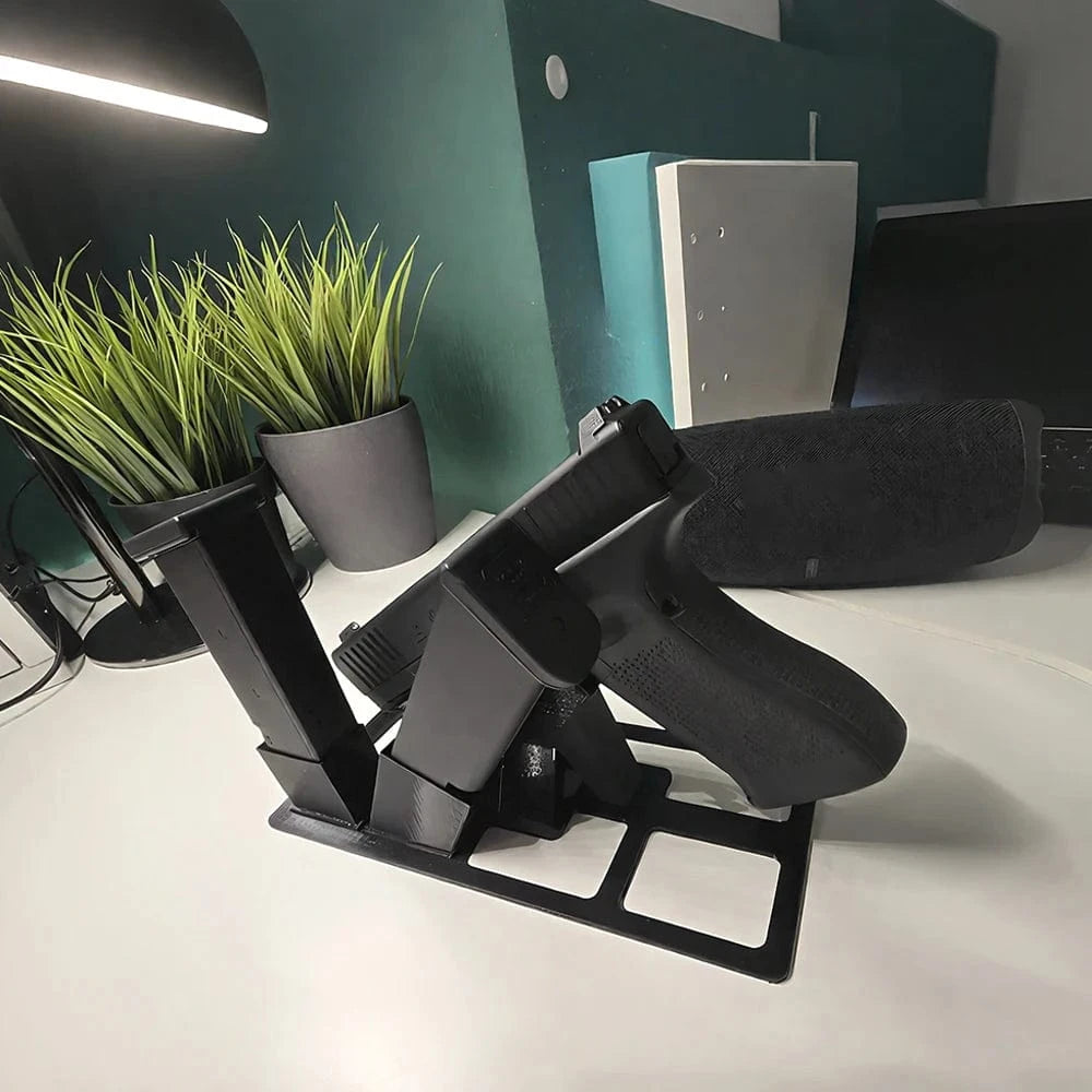 Présentoir pistolet compatible Glock 17 et Glock 19 avec double porte-chargeurs pour un rangement et une présentation optimisés.